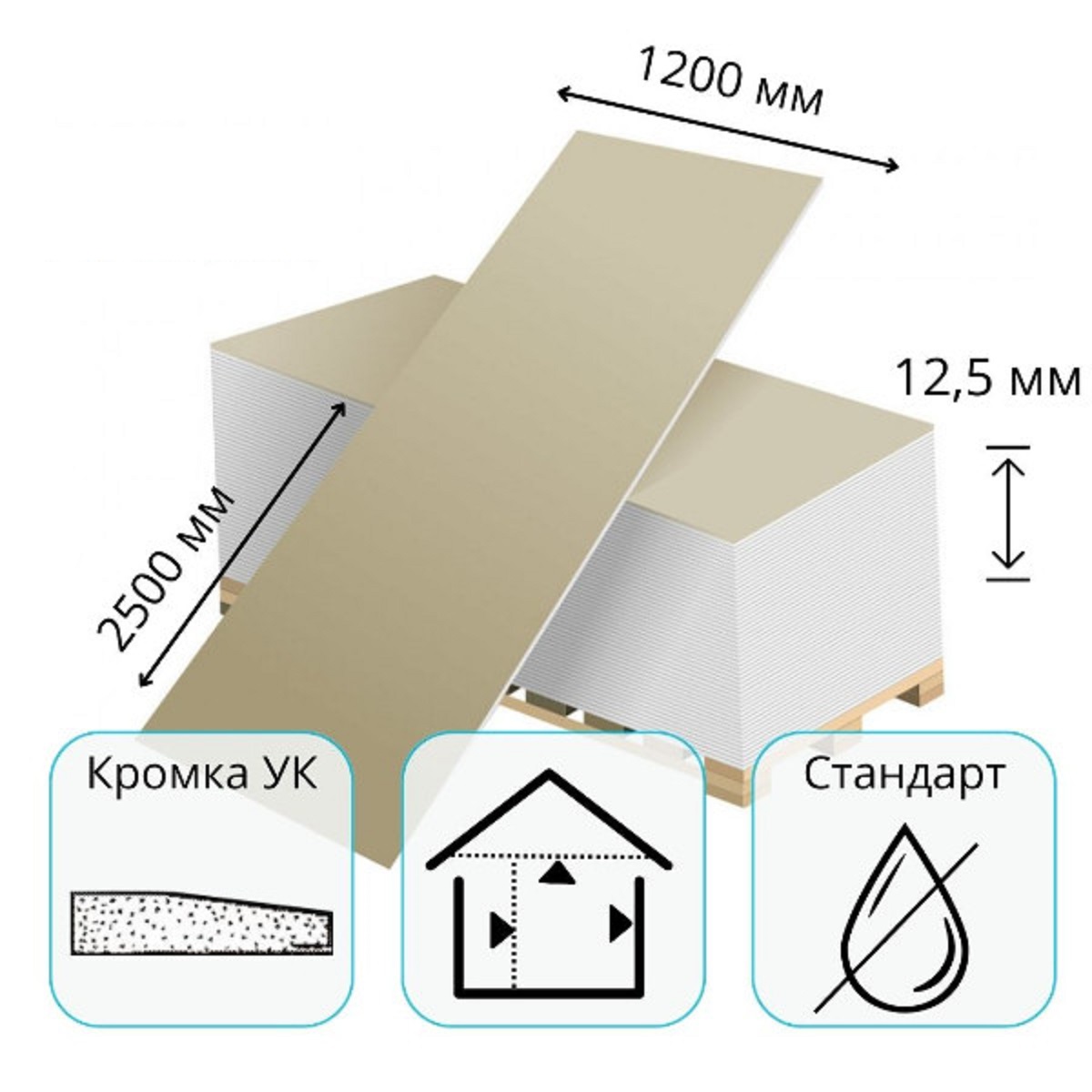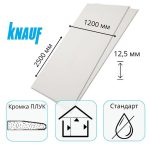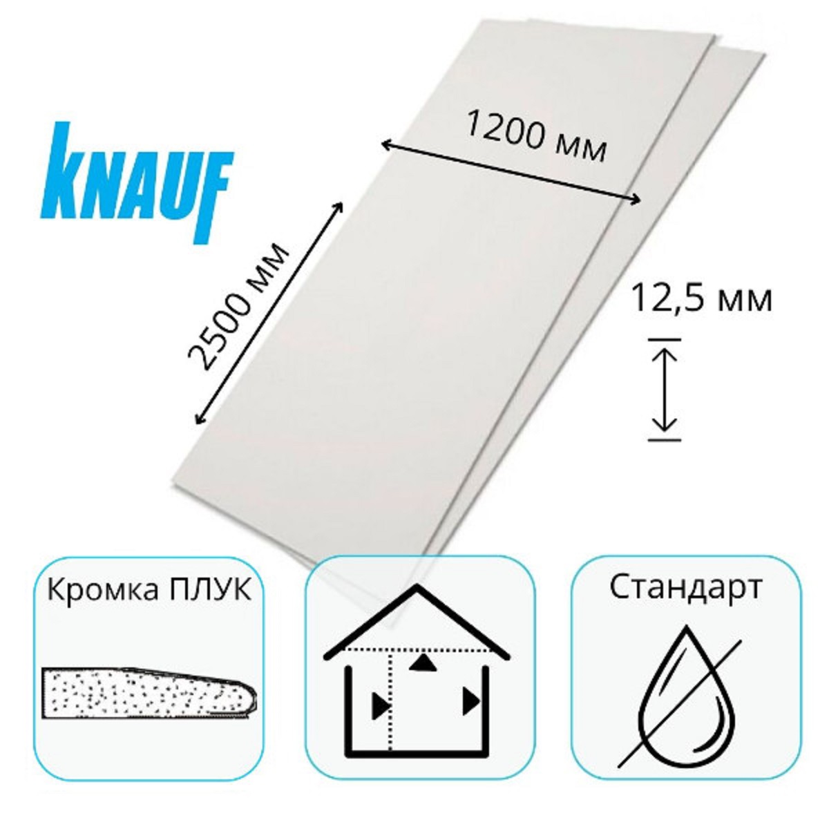 Гипсокартон стеновой обычный КНАУФ (Knauf) 2500х1200х12,5 мм применяется для устройства перегородок, подвесных потолков, облицовок стен, в зданиях и помещениях с сухим и нормальным влажностными режимами, таких как гостиная, спальня, коридор и т.п.