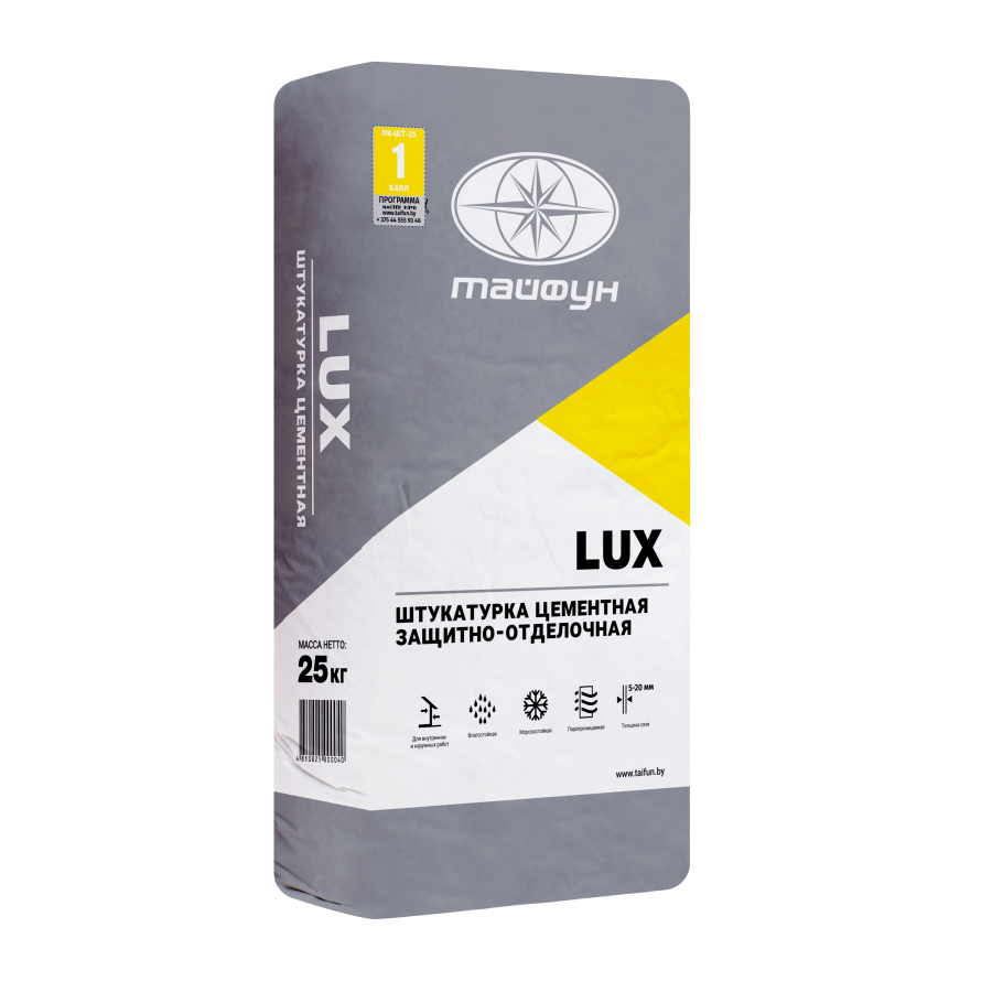 Цементная штукатурка Тайфун LUX М100 F75, 25 кг — надежный материал для выравнивания стен, потолков и других поверхностей в помещениях и на улице. Состав обеспечивает прочное, долговечное покрытие, устойчивое к влаге, морозу и механическим воздействиям. Идеально подходит как для подготовки основания под декоративные отделочные материалы, так и для выполнения ремонтных работ на существующих поверхностях. Используется на бетоне, кирпиче, газосиликатных и керамзитобетонных блоках, гипсовых плитах и минеральных штукатурках.